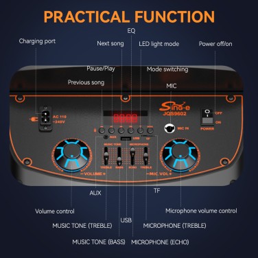 Support: ●BT(Bluetooth), ●FM Radio, ●USB, ●TF Card, ●AUX, ●MIC, ●TWS(True Wireless Stereo), ●RGB Lighting, ●Volume knob, ●DSP effect.
