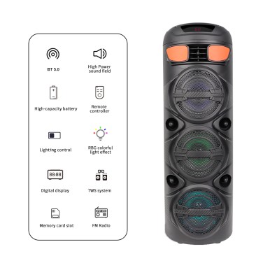 Support: ●BT(Bluetooth), ●FM Radio, ●USB, ●TF Card, ●AUX, ●MIC, ●TWS(True Wireless Stereo), ●Color Lighting, ●Volume control, ●Battery protection.
