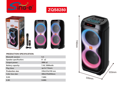 Support: ●BT(Bluetooth), ●FM Radio, ●USB, ●TF Card, ●AUX, ●MIC, ●TWS(True Wireless Stereo), ●RGB Lighting, ●LED Display, ●Volume knob, ●DSP IC.