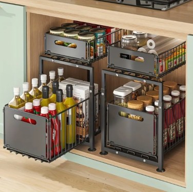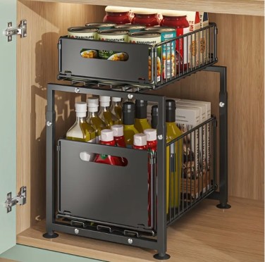 2단 싱크대 아래 수납장, 풀아웃 금속 서랍, 주방 및 욕실용 철제 캐비닛 수납장, 높이 조절 가능, 블랙 > 잡화