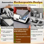 GENAI 전기 칼날 샤프너 USB-C 고속 충전 & 리튬 배터리 - 셰프, 파링, 세라믹, 포켓 나이프용 전문가용 칼날 샤프너 - 원터치 작동, 안전한 미끄럼 방지 베이스, 가정 및 캠핑용 컴팩트 디자인 - 셰프와 홈쿡을 위한 이상적인 주방 도구, 슬림한 가전제품, 내구성 있는 구조