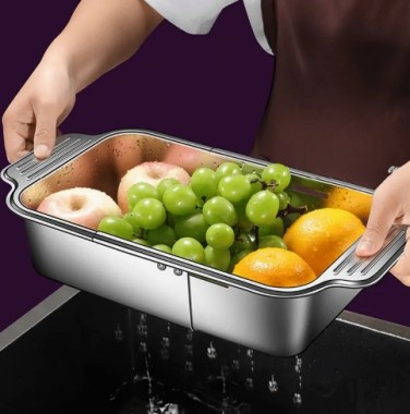 1개 스테인리스 스틸 텔레스코픽 싱크대 위 체 바구니 - 과일, 야채 헹구기, 파스타 물기 제거 및 접시 건조용 조절 가능 20.96cm x 34.92cm-43.81cm - 내구성 있고 쉽게 청소할 수 있는 주방 필수 도구 > 잡화